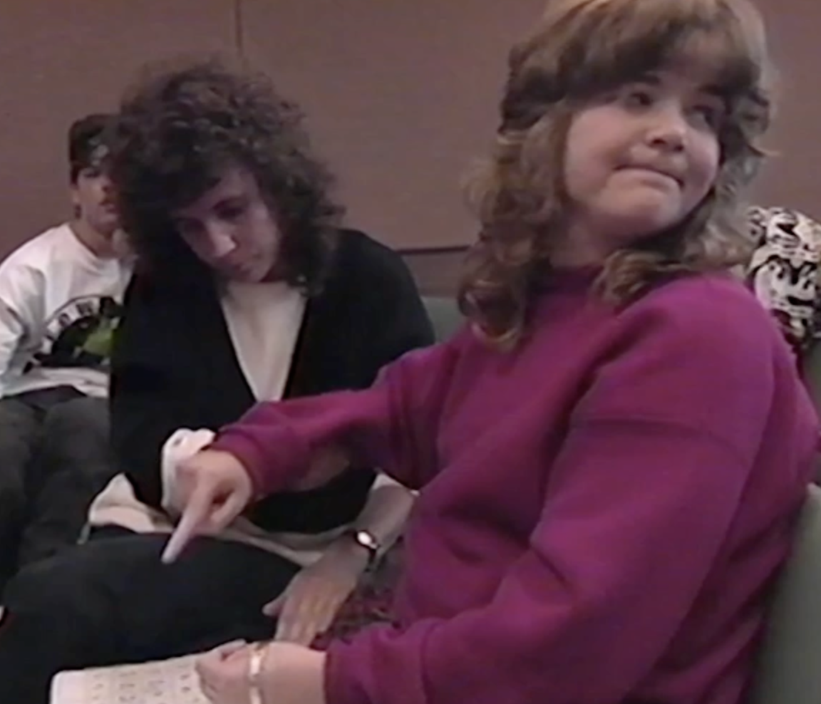 The facilitator stares intently at the letter board and guides her client’s finger toward it while the client looks away from the letter board. (Prisoners of Silence, 1993)